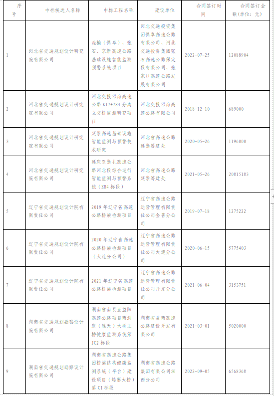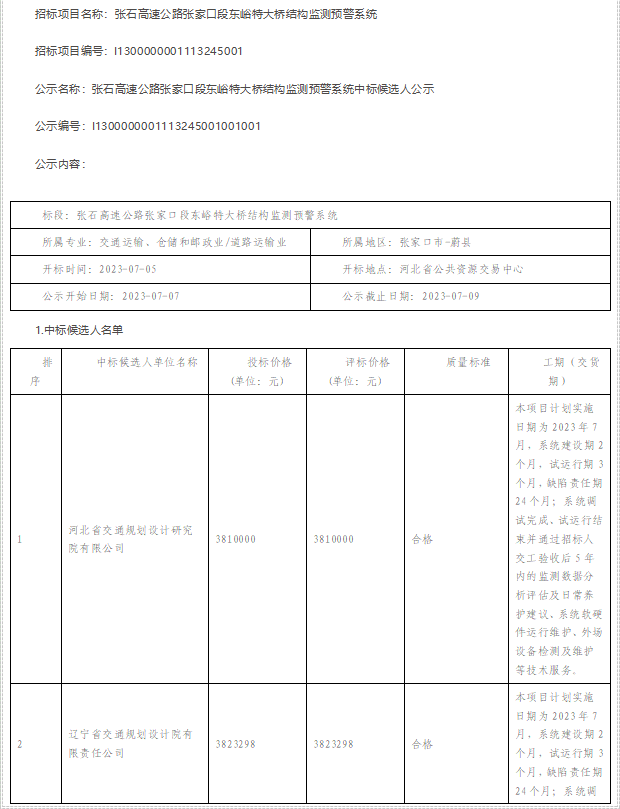 張石高速公路張家口段東峪特大橋結(jié)構(gòu)監(jiān)測預(yù)警系統(tǒng)中標(biāo)候選人公示